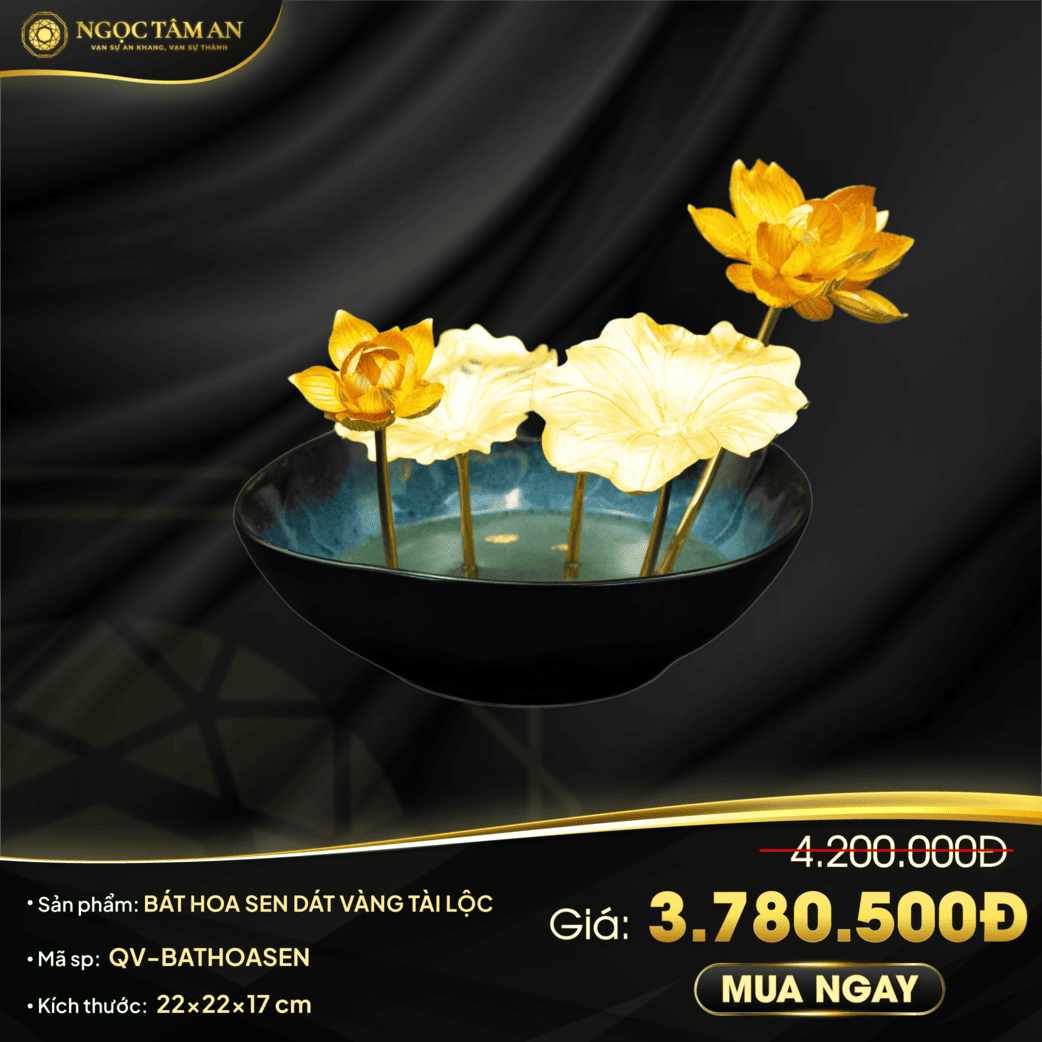 Với thiết kế tinh xảo và chất liệu cao cấp, bát hoa sen dát vàng không chỉ làm đẹp cho không gian sống mà còn mang lại may mắn, bình an và thịnh vượng cho người nhận. Đừng bỏ lỡ cơ hội sở hữu bát hoa sen dát vàng và các sản phẩm cao cấp khác từ Ngọc Tâm An. Hãy liên hệ ngay với chúng tôi để được tư vấn và đặt hàng.