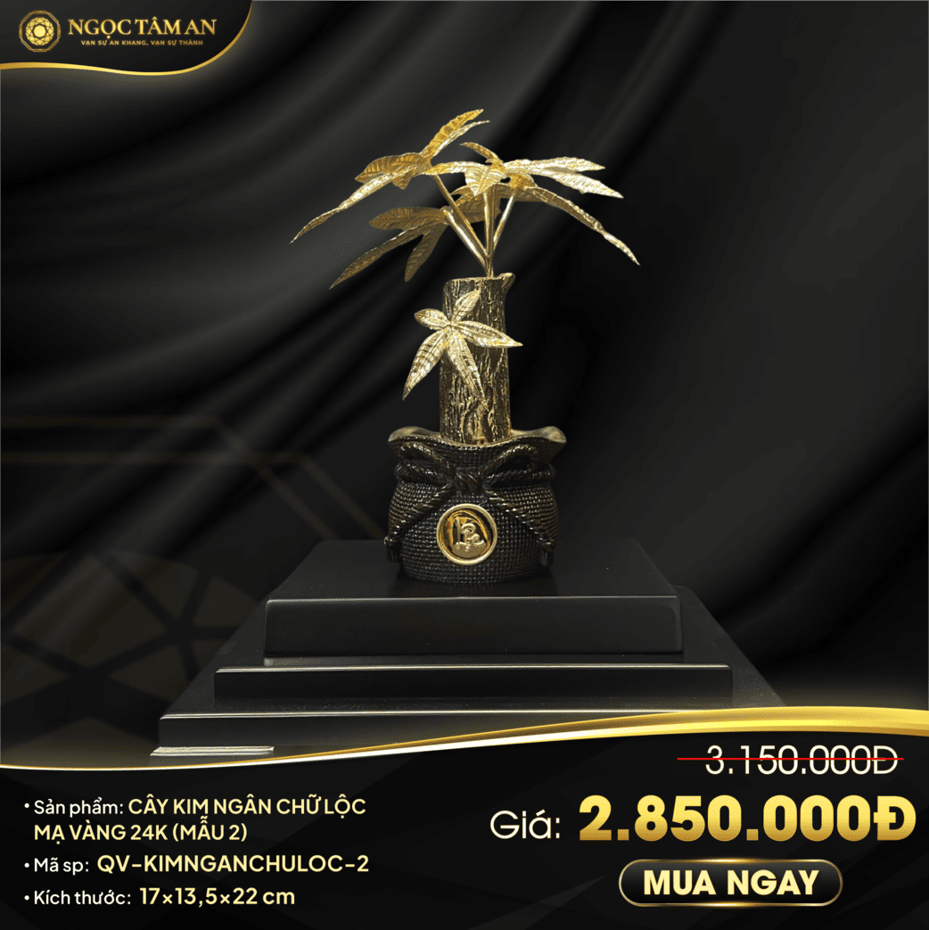 Trong quan niệm phong thủy, Kim Ngân có nghĩa là tiền vàng, là loài cây đại diện cho sự sung túc và khả năng quản lý tài chính vững vàng. Cây Kim Ngân chữ Lộc mạ vàng 24K (Mẫu 2) là một tác phẩm nghệ thuật cao cấp, kết hợp giữa linh khí của loài cây tài lộc và vẻ đẹp bất diệt của vàng ròng, mang lại năng lượng tích cực và sự thịnh vượng cho gia chủ.
