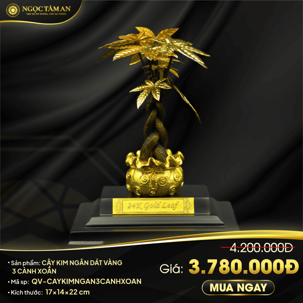 Cây kim ngân 3 cành xoắn dát vàng 24K là một kiệt tác nghệ thuật phong thủy trong bộ sưu tập quà tặng mạ vàng của chúng tôi, được chế tác tỉ mỉ từ đồng nguyên chất và dát vàng lá 24K. Ba cành cây xoắn vào nhau tượng trưng cho sự đoàn kết, gắn kết, mang đến may mắn và tài lộc cho gia chủ. Mỗi đường nét, hoa văn đều được các nghệ nhân tài hoa chạm khắc tinh xảo, tạo nên một tác phẩm nghệ thuật độc đáo và sang trọng. Với ý nghĩa phong thủy sâu sắc và thiết kế độc đáo, cây kim ngân 3 cành xoắn không chỉ là một món đồ trang trí mà còn là một biểu tượng của sự thịnh vượng và thành công.