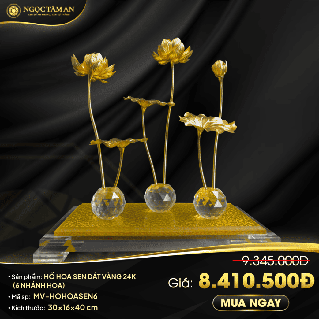 Hồ hoa sen dát vàng 24K (6 nhánh) tinh xảo từ Ngọc Tâm An. Biểu tượng của sự thanh cao may mắn và thịnh vượng. Món quà tặng ý nghĩa cho khai trương tân gia lễ Tết.