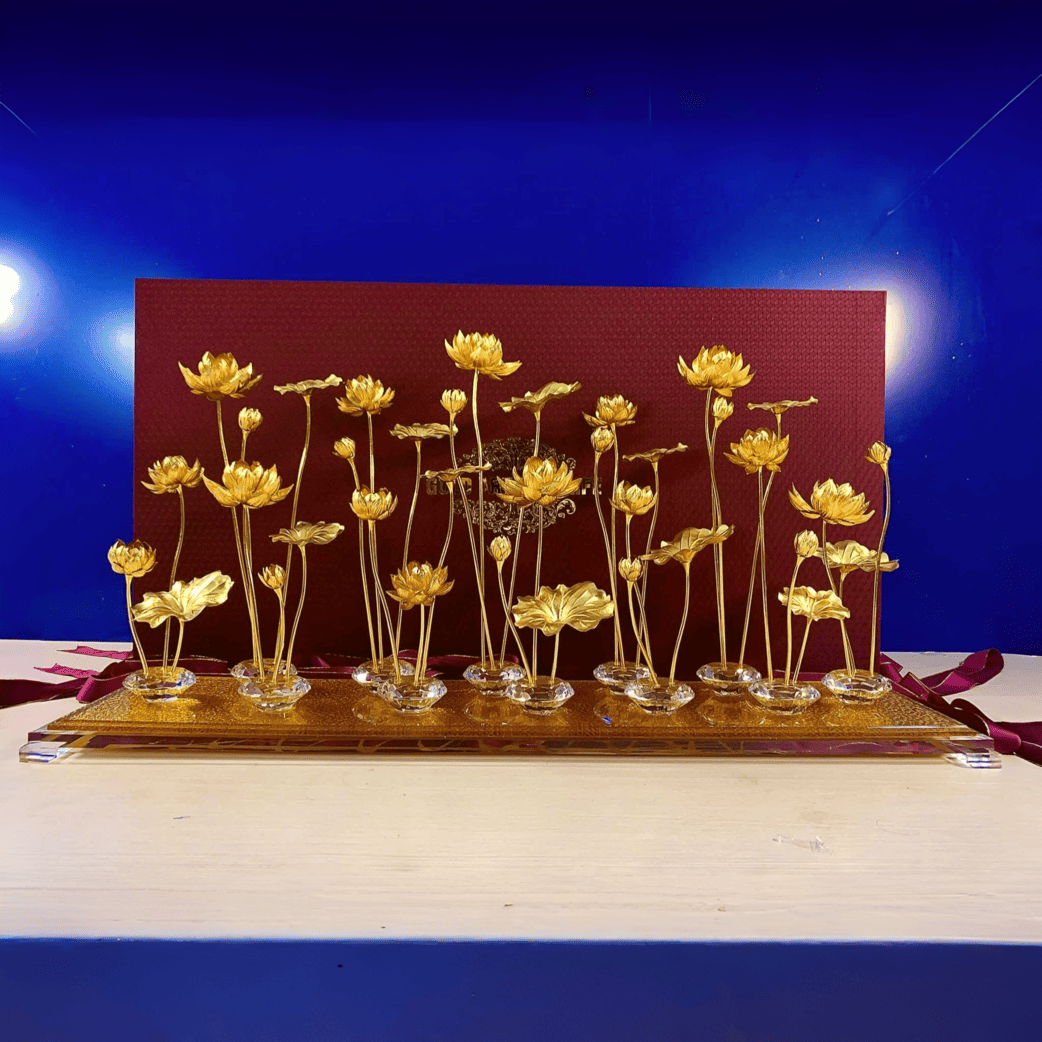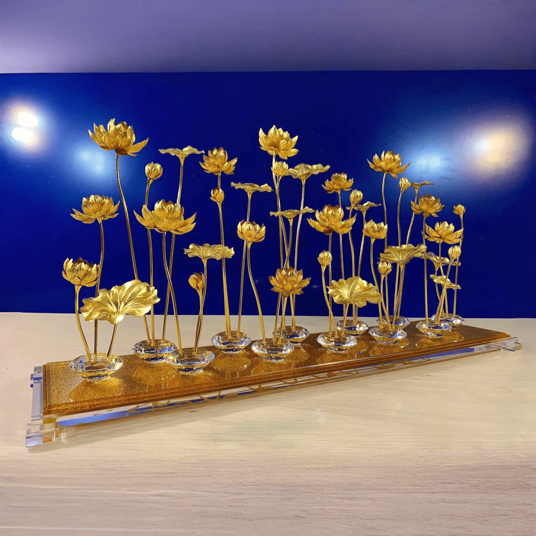 Với 12 củ sen đại diện cho sự luân chuyển may mắn của 12 tháng trong năm và 36 nhánh hoa vươn cao, tác phẩm là sự kết hợp hoàn hảo giữa triết lý Phật giáo sâu sắc và nghệ thuật dát vàng thượng lưu.