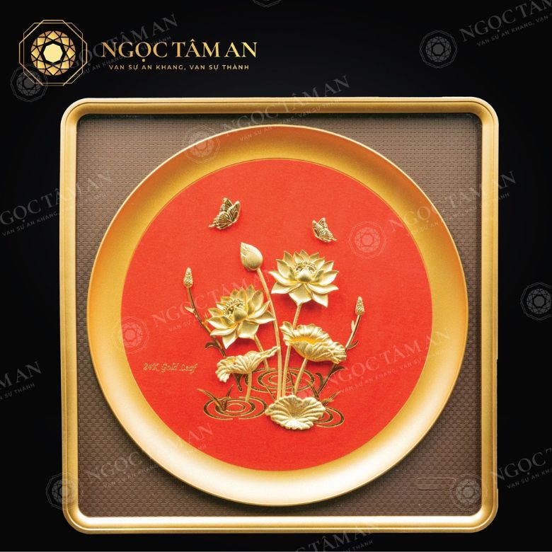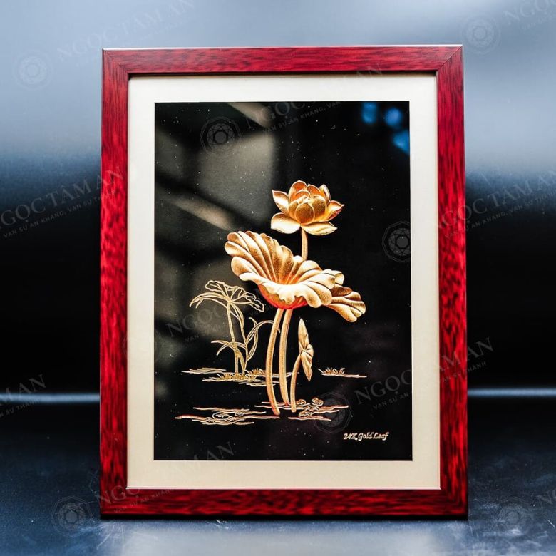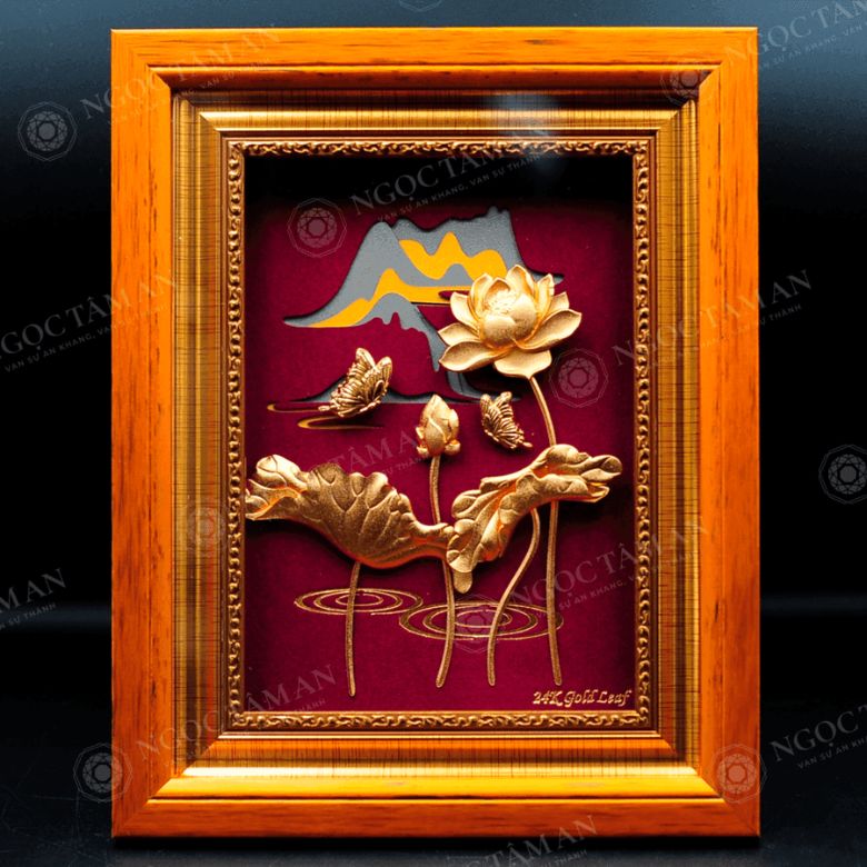 Tranh hoa sen vàng này có kích thước nhỏ gọn với khung gỗ cổ điển và lớp dát vàng 24K tinh tế trên nền đỏ. Đây là món quà phong thủy vừa đẹp mắt, vừa mang lại may mắn cho gia chủ.