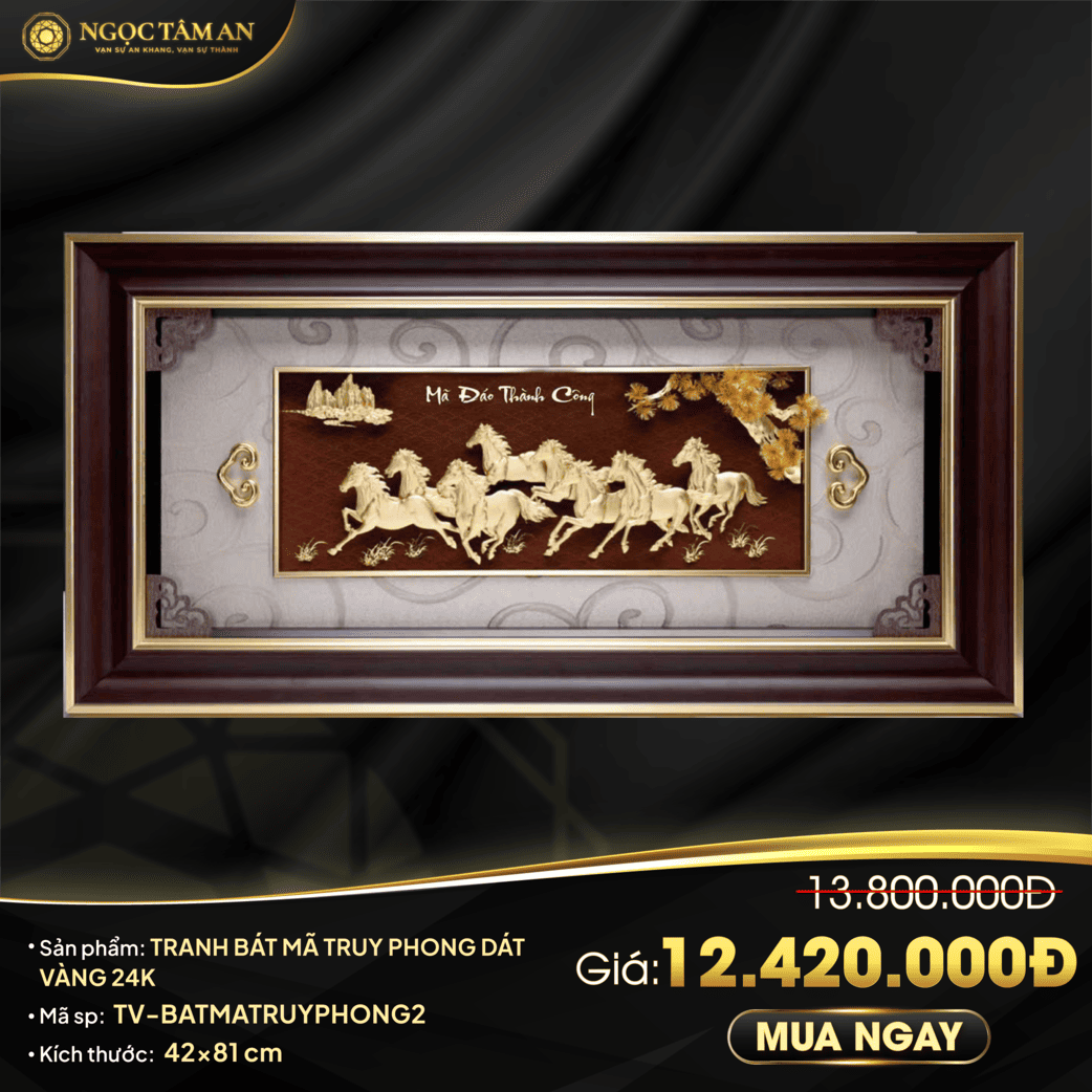 Trong nghệ thuật phong thủy, tranh mã đáo thành công mạ vàng luôn được xem là món quà quý giá, mang ý nghĩa chúc phúc và khẳng định sự thăng tiến. Nổi bật trong số đó là Tranh Bát Mã Truy Phong mạ vàng 24K Ngọc Tâm An, một tác phẩm hội tụ cả vẻ đẹp nghệ thuật tinh xảo lẫn giá trị tâm linh sâu sắc. Với từng đường nét chế tác tỉ mỉ, bức tranh tái hiện hình ảnh tám chú ngựa phi nước đại, tạo cảm giác sống động, mạnh mẽ và tràn đầy sinh khí.