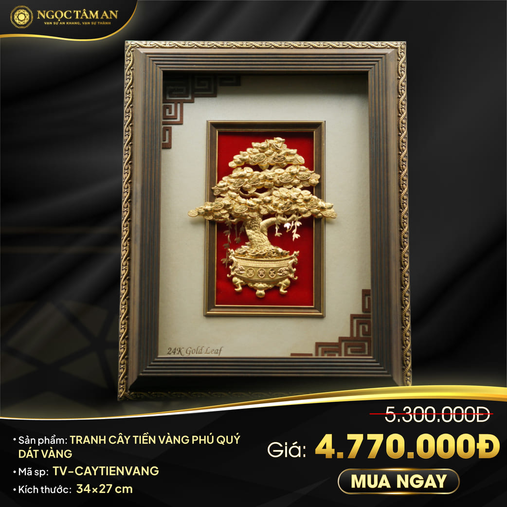 Bức tranh “Cây tiền vàng phú quý” dát vàng 24K không chỉ là một món đồ trang trí mà còn là một tác phẩm nghệ thuật mang ý nghĩa phong thủy sâu sắc. Đây là món quà ý nghĩa để bạn gửi gắm những lời chúc tốt đẹp nhất đến người thân, bạn bè và đối tác.