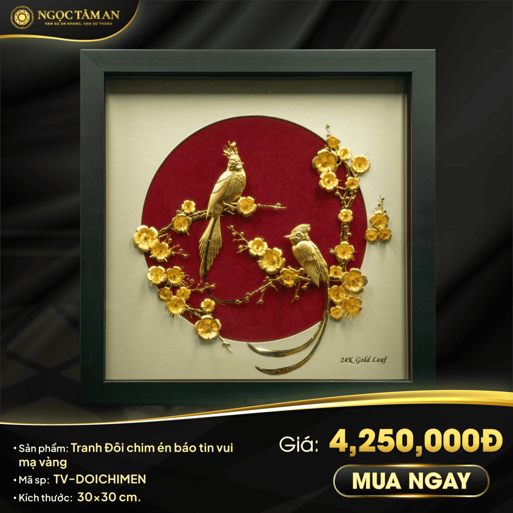 Bức tranh “Đôi chim én báo tin vui” dát vàng 24K không chỉ là một món đồ trang trí mà còn là một tác phẩm nghệ thuật mang ý nghĩa phong thủy sâu sắc. Đây là món quà ý nghĩa để bạn gửi gắm những lời chúc tốt đẹp nhất đến người thân, bạn bè và đối tác.
