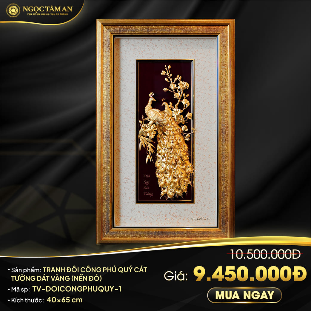 Tranh đôi chim công dát vàng 24K kích thước 650 x 400 mm của Ngọc Tâm An là một tác phẩm nghệ thuật sang trọng mang giá trị thẩm mỹ kết hợp ý nghĩa phong thủy sâu sắc. Hình ảnh hai chú công uyển chuyển khoe đuôi lộng lẫy trên nền vàng óng ánh tạo nên khí chất quyền quý, đồng thời gửi gắm thông điệp cát tường và hạnh phúc bền lâu. Hãy cùng đi sâu hơn vào bức tranh mạ vàng này nhé!