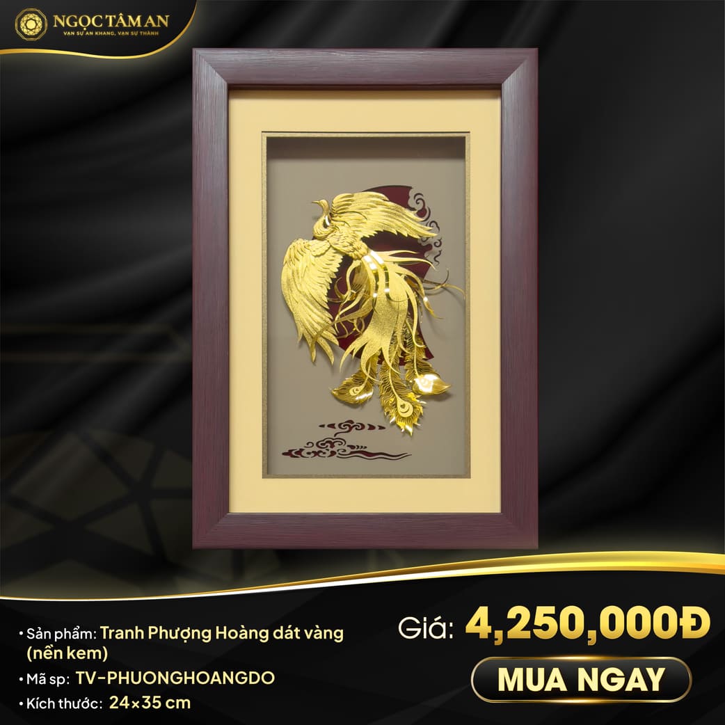Trong Tứ Linh huyền thoại, Phượng Hoàng là vua của các loài chim, là biểu tượng tối cao của đức hạnh, vẻ đẹp và sự tái sinh từ ngọn lửa vinh quang. Siêu phẩm Tranh Phượng Hoàng Lửa Cát Tường của Ngọc Tâm An, với hình tượng Phượng Hoàng mạ vàng 24K quyền uy ngự trên nền đỏ rực rỡ, chính là sự hội tụ của nguồn năng lượng mạnh mẽ nhất. Đây không chỉ là một kiệt tác trang trí, mà là một pháp khí phong thủy tối thượng, mang lại vận may đỉnh cao và khẳng định vị thế của người sở hữu.