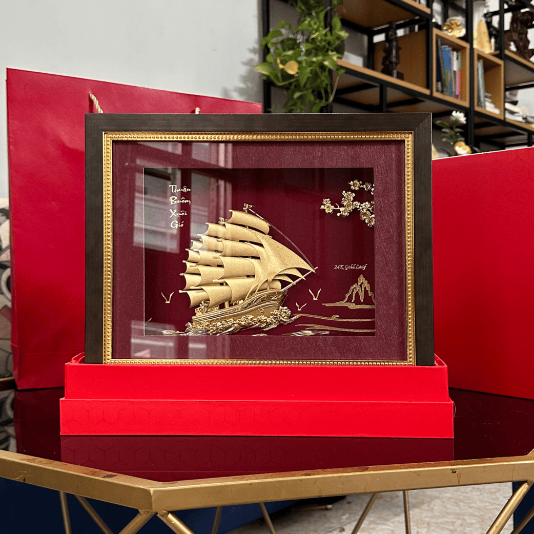 Bức tranh thuyền buồm thuận buồm xuôi gió mạ vàng là sự kết hợp hoàn hảo giữa nghệ thuật chế tác tinh xảo và giá trị phong thủy sâu sắc. Hình ảnh con thuyền căng buồm tiến ra khơi, lướt nhẹ trên sóng, biểu trưng cho con đường hanh thông, mọi việc thuận lợi và ý chí kiên định để chinh phục thành công.
